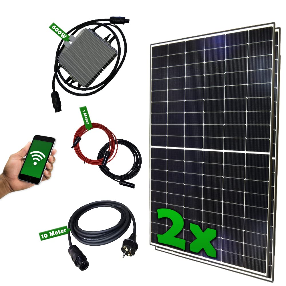 ✅ Lieferumfang: GREENSURFER 600W Balkonkraftwerk Komplett-Set. Enthalten sind 2x Premium-Solarmodule mit schwarzem Rahmen und jeweils 410Wp, ein Wechselrichter der Marke DEYE mit einer Ausgangsleistung von 600 Watt, ein 1m langes MC4 Verlängerungskabel und ein 10m langes Steckdosenkabel.